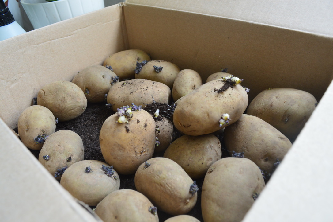 Väl hemma letade jag upp ett par kartonger och satte upp mitt lilla experiment: förgro vs förodla. I den ena lådan ställde jag helt sonika ner potatisarna tätt intill varandra. I den andra la jag först ett tunt lager blomjord på botten. Tydligen skulle man ha ”sandig plantjord”, men man tager vad man haver och nu hade jag lite blomjord hemma.