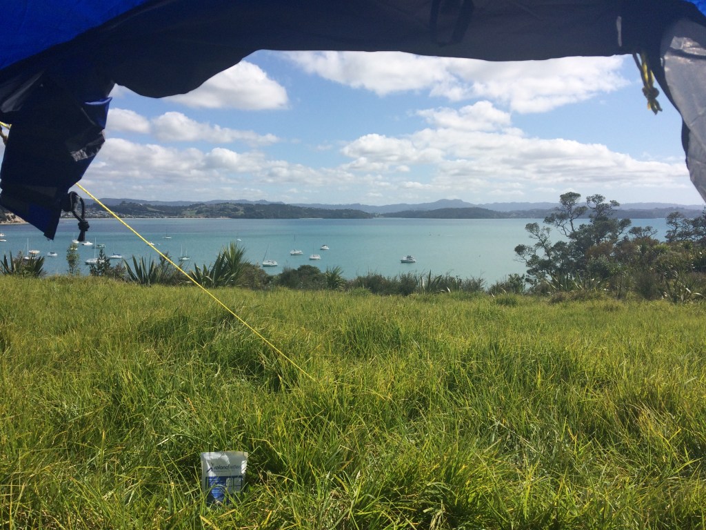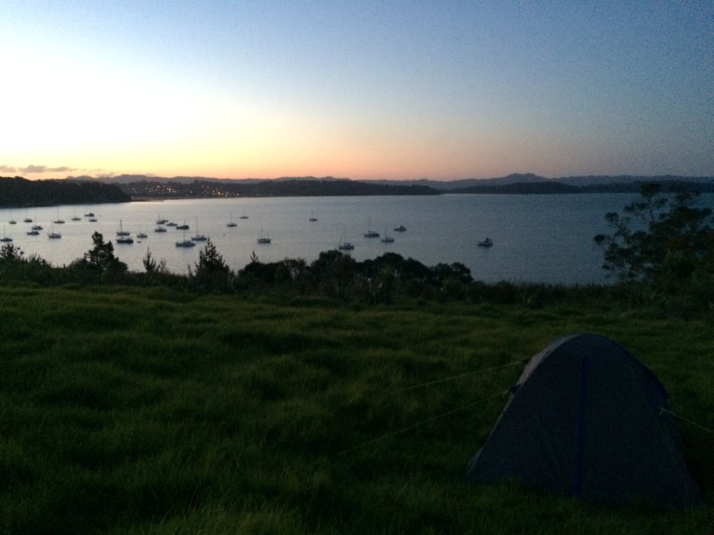 Efter att ha gjort ett par stopp och fikat började vi se oss om efter bra tältplatser. Det finns ”vanliga” campingar, och lite billigare så kallade DOC-sites, som sköts av Department Of Conservation. De flesta finns samlade i en behändig app. Men vi kom sent på eftermiddagen och behövde bara nånstans att slå upp tältet några timmar – så vi var dumsnåla. Vi körde ut på en halvö, förbi en privat väg upp på en kulle. Så i en sluttning på baksidan av kullen fann vi vår plats, tillräckligt skyddade från att bli upptäckta hoppades vi. Tältet stod uppe lagom till solen gick ner.