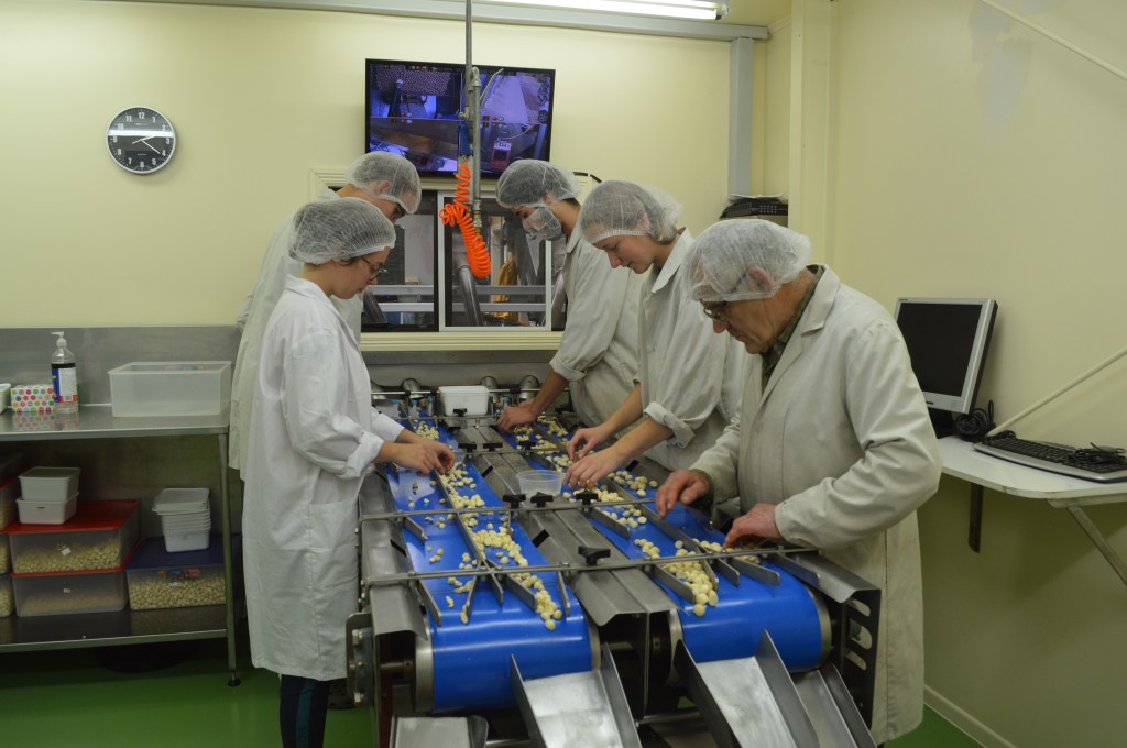 De olika banden leder ner nötterna i olika lådor. Här är själva processandet slut. Innehållet i lådorna läggs sedan i påsar som görs syrefria genom att kväve pumpas i. Kvävet är tyngde än syret vilket gör att det läggs ”på botten” och därmed tvingar ut syret. På så vis håller nötterna två år.