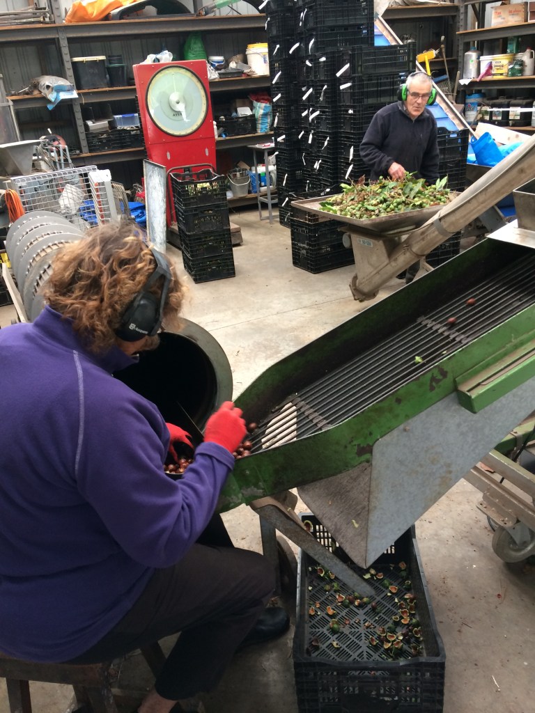 Ur dessa behållare sugs nötterna sedan genom ett annat rör in i ett rum bredvid där de sista finjusteringarna görs. Där står ett gäng wwoofare redo och sorterar nötterna på ett rullande band. Det är ett monotont arbete där man hela tiden stirrar ner på bandet och rör händerna fram och tillbaka. Men eftersom maskinerna är ganska bökiga att köra och städa gör man det inte bara en timma – utan när maskinerna väl är igång kör man en hel dag.