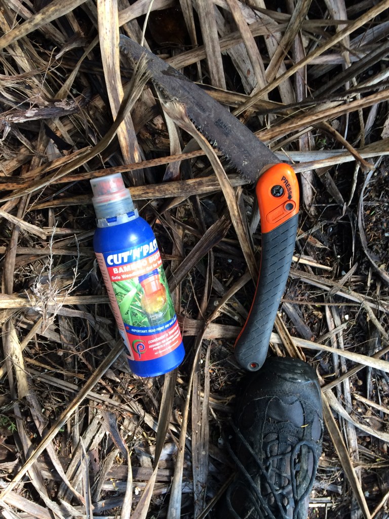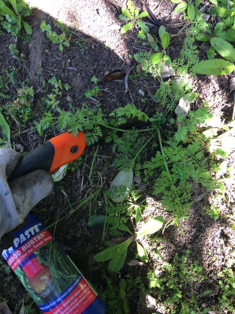 Ibland har vi ett specifikt mål, som att skära ner pampasgräs, som har sitt naturliga habitat i Sydamerika, och spraya rötterna med gift. Det är ett fiffigt gift på så sätt att det är framtaget för att bara döda vissa arter. Växter som däremot växer här naturligt påverkas inte av giftet.